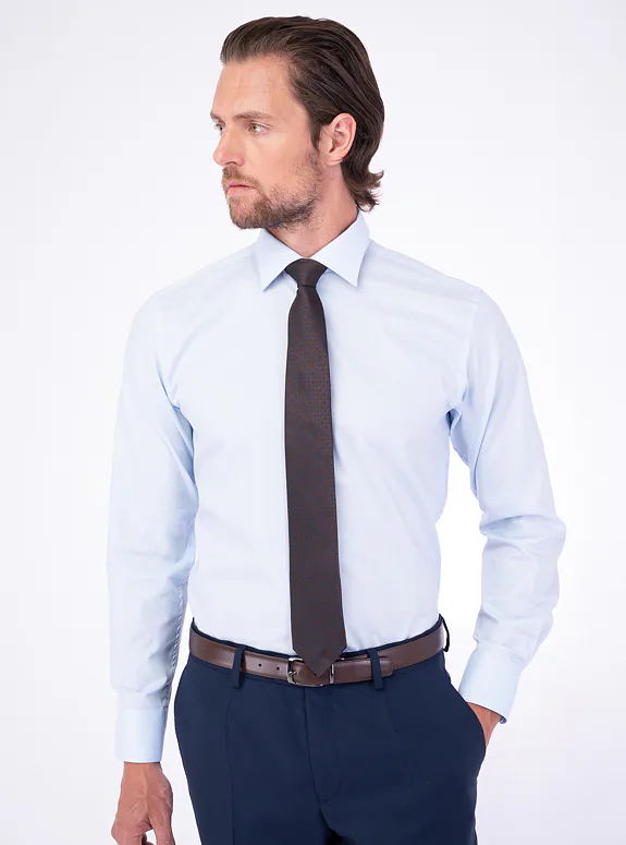 Modrá košile z čisté bavlny od italského výrobce materiálů Albini. Košile je ušitá ve volném střihu pro větší pohodlí. Doporučujeme pro formální příležitosti.