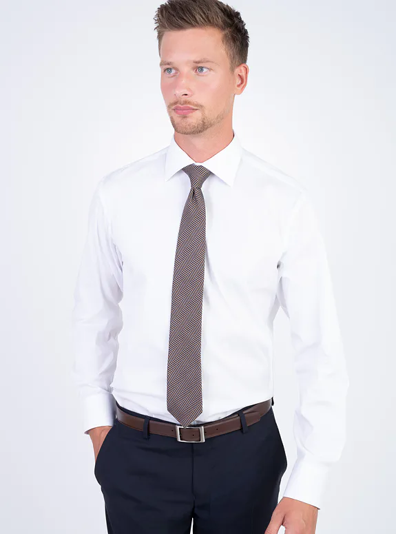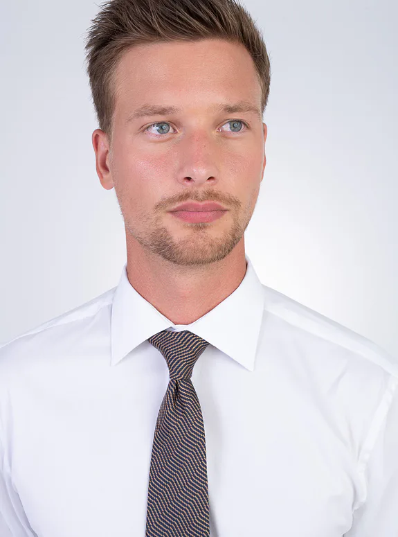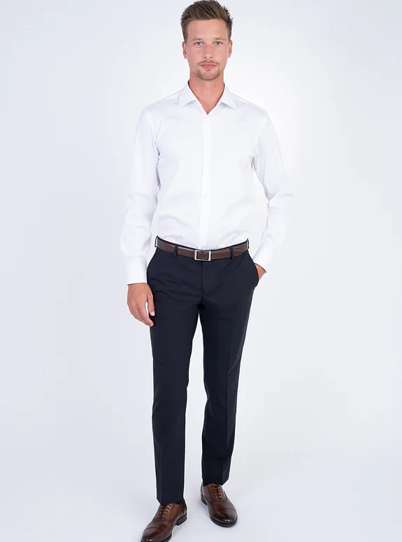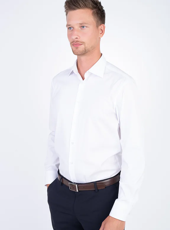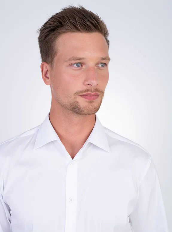Bílá košile ze směsové bavlny s příměsí elastanu od italského výrobce materiálů Albini. Košile je ušitá ve standardním střihu pro větší pohodlí. Doporučujeme pro formální příležitosti.