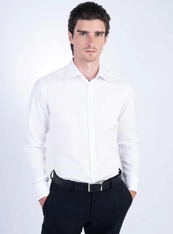 Bílá košile ze směsové bavlny s příměsí elastanu od italského výrobce materiálů Albini. Košile je ušitá v přiléhavém střihu, který kopíruje postavu. Doporučujeme pro formální příležitosti.