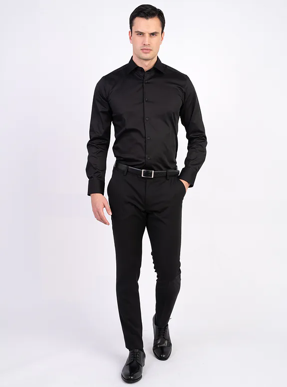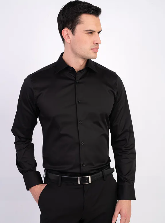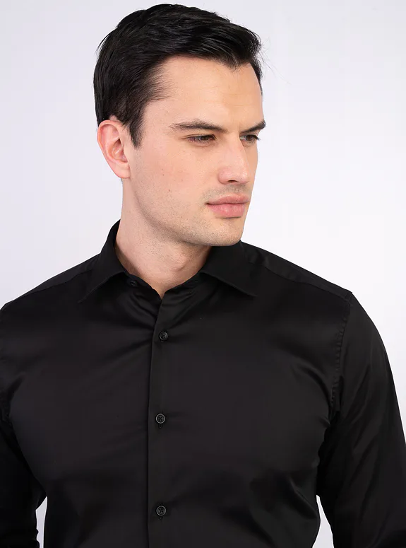 Černá košile ze směsové bavlny s příměsí elastanu od italského výrobce materiálů Albini. Košile je ušitá ve standardním střihu pro větší pohodlí. Doporučujeme pro formální příležitosti.
