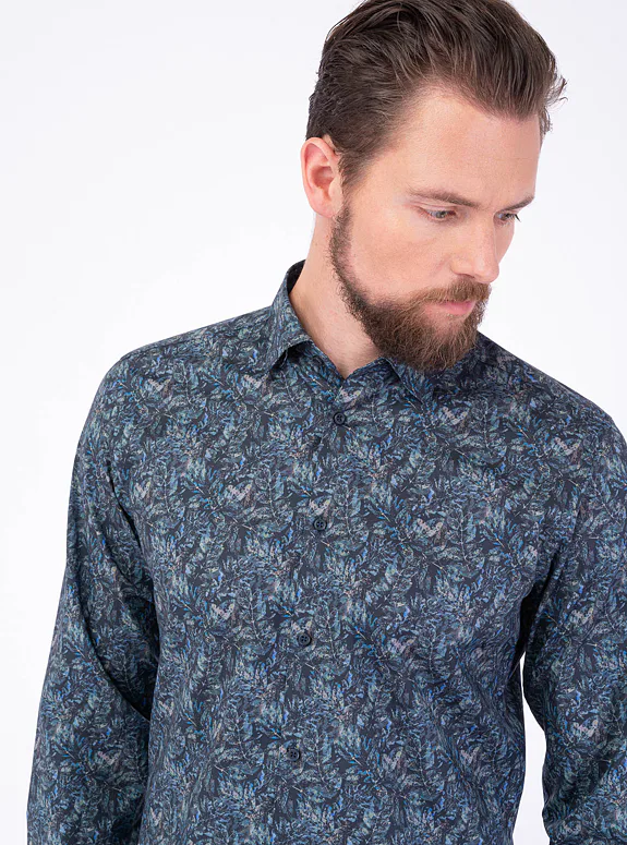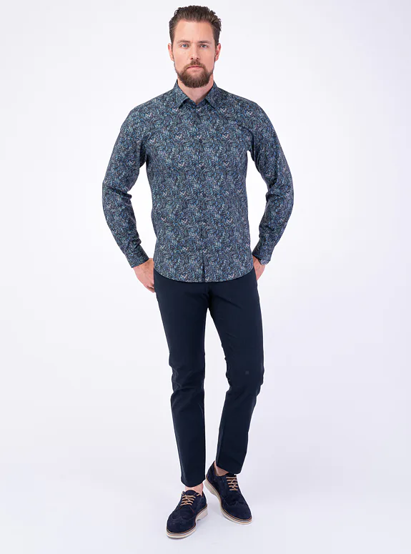 Modrá košile z bavlny s příměsí elastanu od slovinského výrobce materiálů Tekstina. Košile je ušitá ve volném střihu pro větší pohodlí. Doporučujeme pro neformální příležitosti.