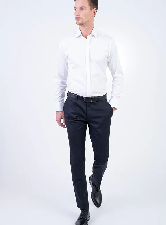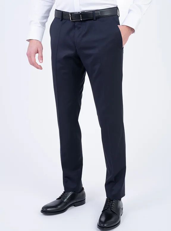 Černé kalhoty z vlny s příměsí elastanu. Kalhoty jsou ušité ve standardním střihu pro větší pohodlí. Doporučujeme pro formální příležitosti.