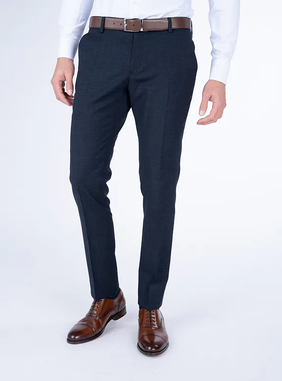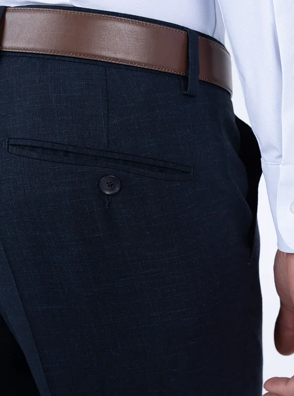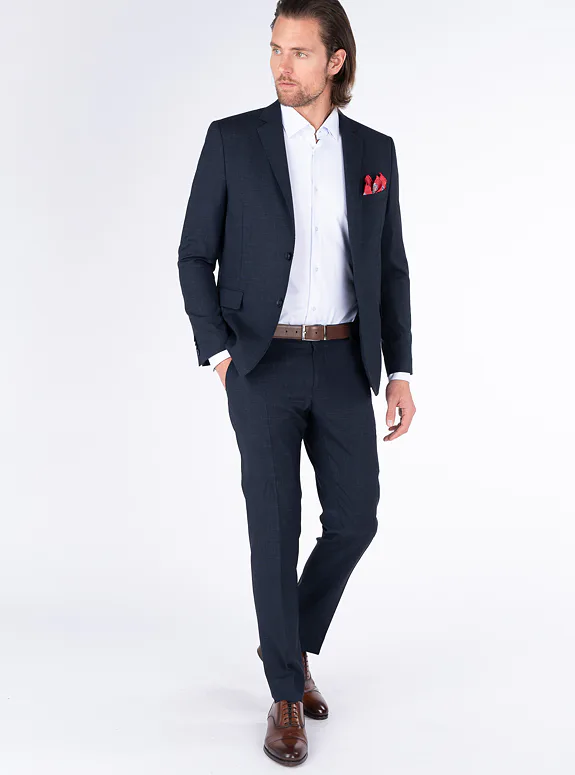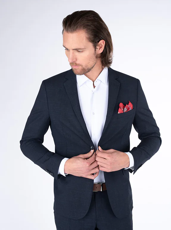 Tmavě modrý oblek z vlny a lnu s příměsí elastanu od italského výrobce materiálů Reda Flexo. Oblek je ušitý v přiléhavém střihu, který kopíruje postavu. Doporučujeme pro formální příležitosti.