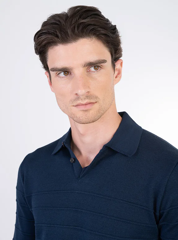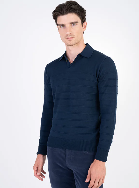 Modrý svetr z merino vlny s příměsí akrylu. Svetr je ušitý ve standardním střihu pro větší pohodlí. Doporučujeme pro neformální příležitosti.